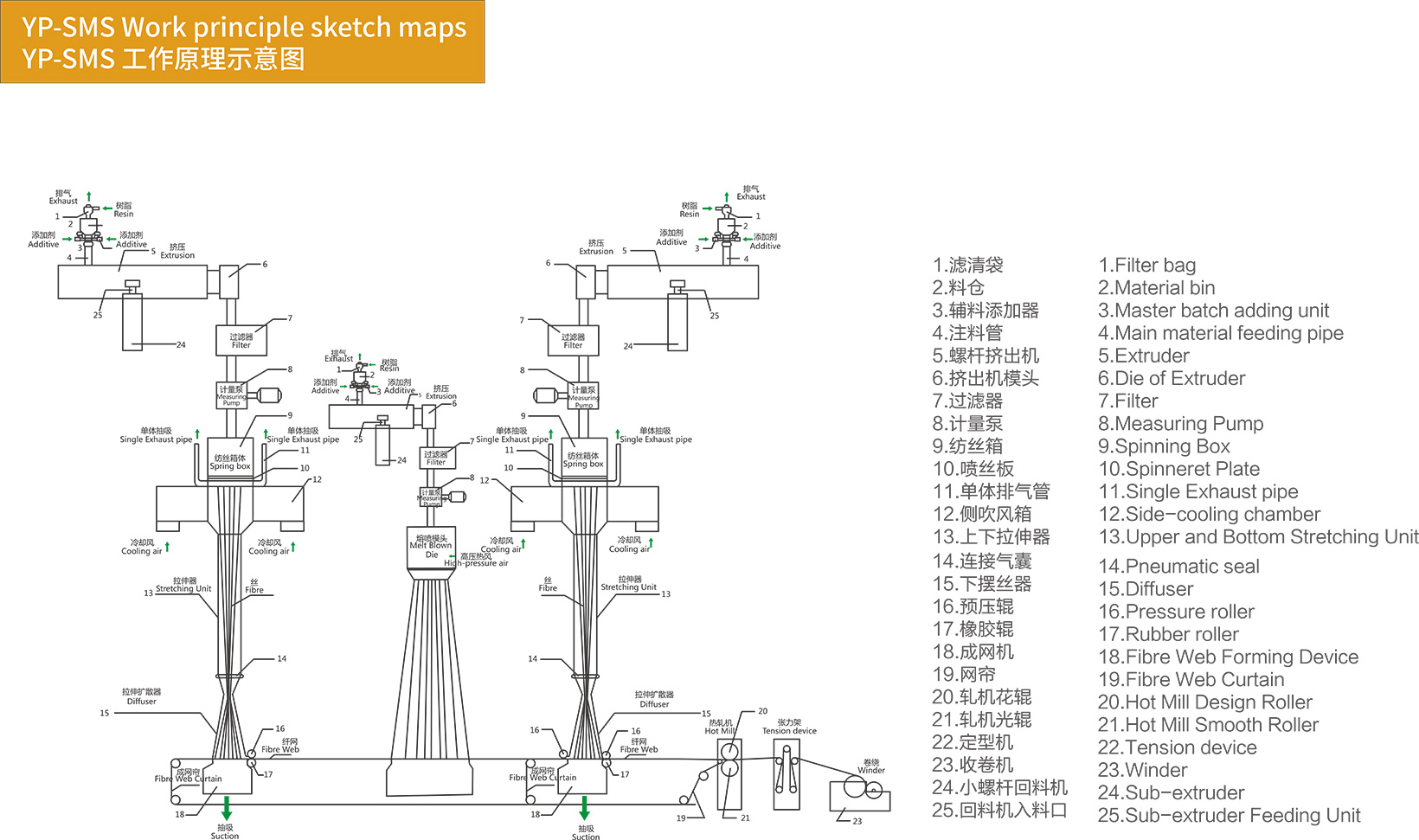 SMS spunbonded melt-blown nonwovens maşınının əsas hissələri müstəqil olaraq istifadə edilə bilər. SMS spunbond meltblown nonwoven maşın tək S, double S, tək M, SM toxunmamış məhsullar istehsal edə bilər.