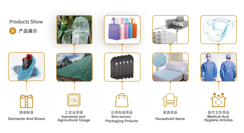 Cərrahi xalatlar, qoruyucu geyimlər, dezinfeksiyaedici çantalar, maskalar, uşaq bezləri, mülki paltarlar Silmək üçün parça, yaş üz dəsmalları, yumşaq salfetlər, gözəllik məhsulları, gigiyena salfetləri, gigiyena yastıqları və birdəfəlik gigiyena paltarları və s.